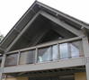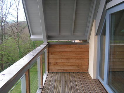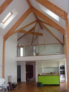A new house replacing an existing one on a sloping site over looking a wooded valley. The design was for low energy consuming home using masonry walls with a 250mm wide insulation filled cavity with concrete floors to give a high thermal mass. The full height living spaces open to the underside of the roof required portal frames to give the supporting structure. Rather than using steelwork frames, we designed Glulam frames which are visible within the building. Glulam beams were also used to form the complicated intersections of the roofs and the for the balconies. As the building is constructed into the hillside, the up-hill side is formed with retaining walls up to first floor level.